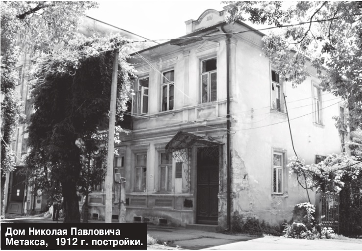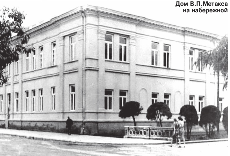 Другой - промышленник К.Д.Метакса. Им было построено на ул. Гейманская (ул. Энгельса, сегодня - Академика Марра, 34, почти напротив здания МВД – прим. автора) в конце ΧΙΧ века красивое здание в классическом стиле, которое и сегодня не потеряло свою привлекательность. Его фасад с треугольным фронтоном во всю ширину здания и с двумя небольшими боковыми ризалитами (выступами) сформирован семью дорическими полуколоннами, карнизы ризалитов оформлены меандром (древнегреческим узором). Автору статьи в 1985г. удалось запечатлеть здание с хоть и обветшалой, но оригинальной парадной дверью. В 1990-х годах парадная дверь этого дома была заменена на окно, тем самым, несколько изменив облик здания.